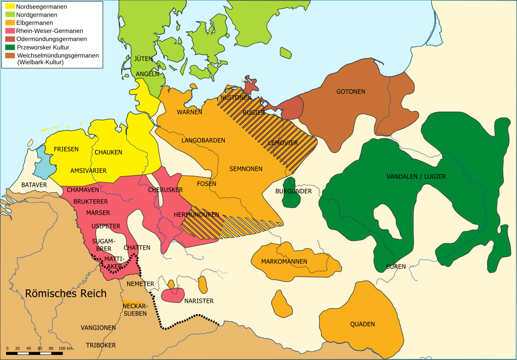 Zu Beginn des ersten Jahrhunderts führten die römischen Legionen eine langwierige militärische Kampagne in Germanien durch, in den Gebieten nördlich der oberen Donau und östlich des Rheins, um die Grenzen des Reiches auszuweiten und die Front zu verkürzen. Sie konnten einige germanische Stämme, darunter die Cherusker, unterwerfen. Den Stämmen gelang es jedoch, die Taktiken der römischen Armee zu erlernen und ihre Stammesidentität zu bewahren. Das Gebiet des heutigen Deutschlands östlich des Rheins blieb außerhalb des Römischen Reiches. Um das Jahr 100, als Tacitus sein Werk Germania verfasste, hatten sich die germanischen Stämme entlang des Rheins und der Donau (am Obergermanisch-Raetischen Limes) angesiedelt und besetzten weite Teile des heutigen Deutschlands; Österreich, der Süden Bayerns und der Westen des Rheinlandes waren jedoch römische Provinzen. Im dritten Jahrhundert entstanden große westgermanische Stämme wie die Alemannen, Franken, Chatten, Sachsen, Friesen, Sugambrer und Thüringer. Um das Jahr 260 überschritten germanische Stämme den Limes und die Donau und drangen in römisch kontrolliertes Gebiet ein
