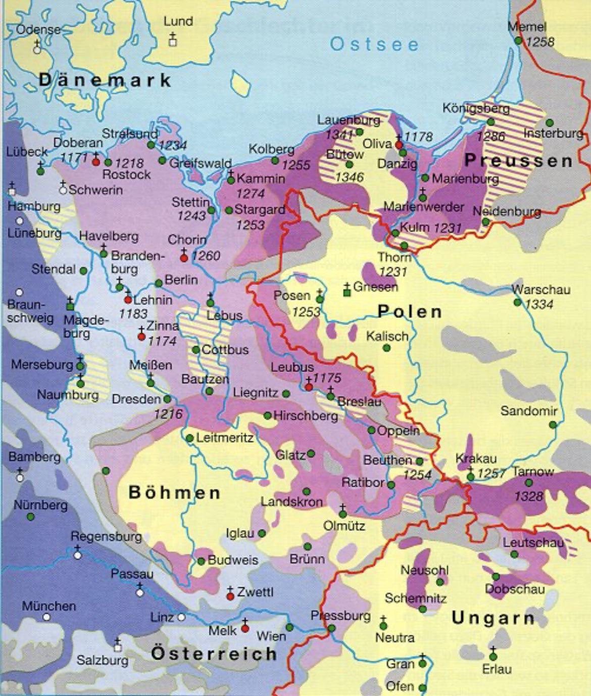 Seit 997 versuchte der neu gegründete Staat der Piasten, die Gebiete seiner nordöstlichen Nachbarn – der Prußen und Jatwinger – zu erobern. Anfang des 13. Jahrhunderts verbündeten sich Konrad von Masowien und Daniel von Galizien mit dem Deutschen Orden, der während der Nordkreuzzüge versuchte, die Balten zu erobern und zu christianisieren, was zu schweren Verlusten auf beiden Seiten führte. In der Folge wurde Preußen (Altpreußenland) 1224 den Rittern übergeben, die dort einen Ordensstaat gründeten. Nach der Vereinigung des Deutschen Ordens mit dem Livländischen Schwertbrüderorden im Jahr 1237 wurde das livländische Gebiet in den Deutschen Orden eingegliedert. Im Jahr 1308 begann dieser Staat mit der Eroberung Pommerellens durch die Einnahme von Danzig. 1346 wurde das Fürstentum Estland vom dänischen König an den Deutschen Orden verkauft. In den fränkischen Marken fanden im 12. Jahrhundert (Ostholstein, Westmecklenburg, zentrale und südliche Marken) und zu Beginn des 13. Jahrhunderts (Pommern, Rügen) große Siedlungsbewegungen statt. Die Aktivitäten des Deutschen Ordens beschleunigten die Besiedlung der Ostseeküste durch Deutsche.