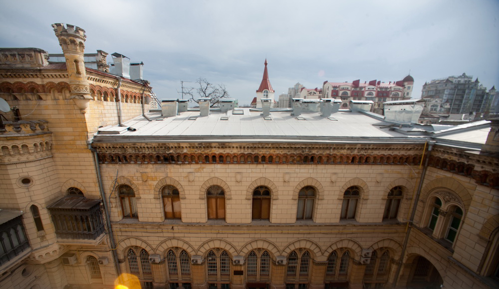 Филармония расположена в историческом центре Одессы. С 1946 года она размещается в одном из красивейших зданий — это бывшая Новая купеческая биржа, возведенная в 1899 году г. по эскизному проекту венского архитектора В.И.Прохаски, переработанному выдающимся архитектором А.И.Бернардацци в стиле итальянской готики. Деревянный потолок зала сделан без единого гвоздя из ливанского кедра, позолочен и расписан. Стены зала украшают 6 панно петербургского художника Н.Каразина. Концертный зал на 1000 мест по красоте и акустическим качествам является одним из лучших в Европе.