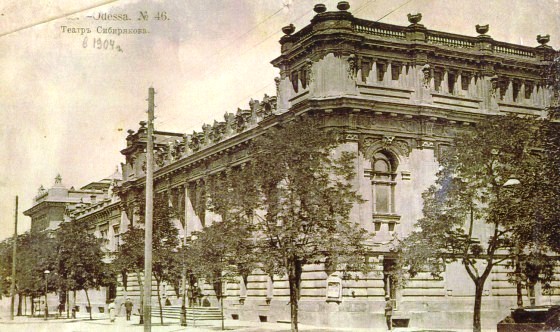 Первым спектаклем на сцене «театра Сибирякова» стали «Плоды просвещения» Л.Н. Толстого. Выбор пьесы не был не случайным. Л.Н. Толстой стал «властителем дум» для русской интеллигенции. Незадолго до открытия театра русскому писателю исполнилось 75 лет. На сцене театра с успехом шли спектакли одесской русской труппы. Кроме того, проходили гастроли выдающихся артистов и музыкантов со всего мира — Марии Савиной, знаменитой «босоножки» Айседоры Дункан, состоялось последнее выступление основателя украинского профессионального театра Марка Кропивницкого.