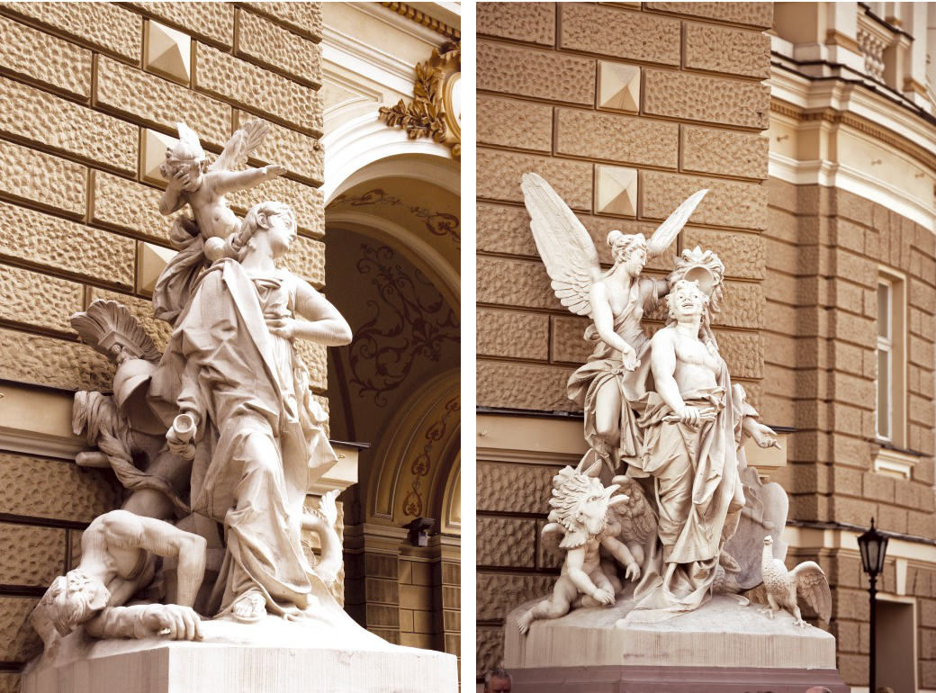 Над фасадом высится скульптурная группа, изображающая покровительницу театрального искусства музу Мельпомену в колеснице, запряженной четырьмя разъяренными пантерами (аллегория: лишь сила искусства способна покорить звериную дикость).