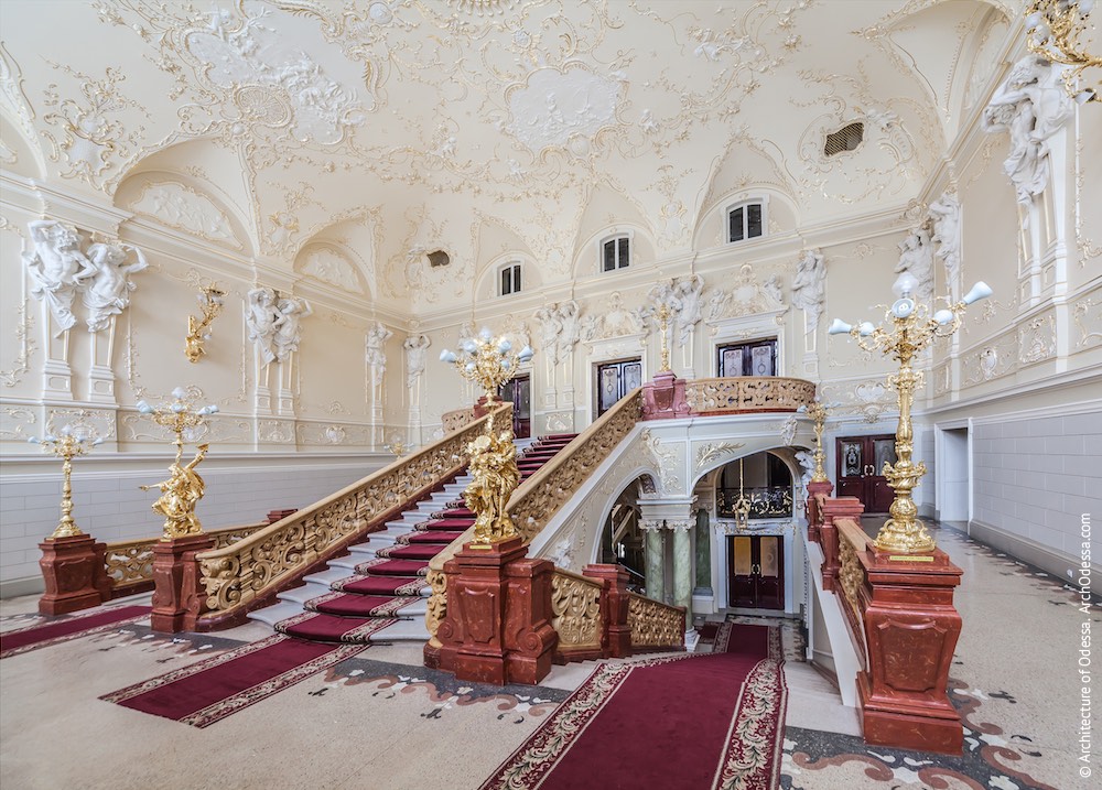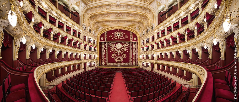 Зрительный зал Одесского оперного театра декорирован в стиле позднего французского рококо, украшен лепным орнаментом с тончайшей позолотой. Главный мотив орнамента – раковина в виде завитков различной формы. Рисунок орнамента нигде не повторяется. Повсюду обилие мрамора, бархата, сияющего хрусталя, сверкающих зеркал и позолоты.