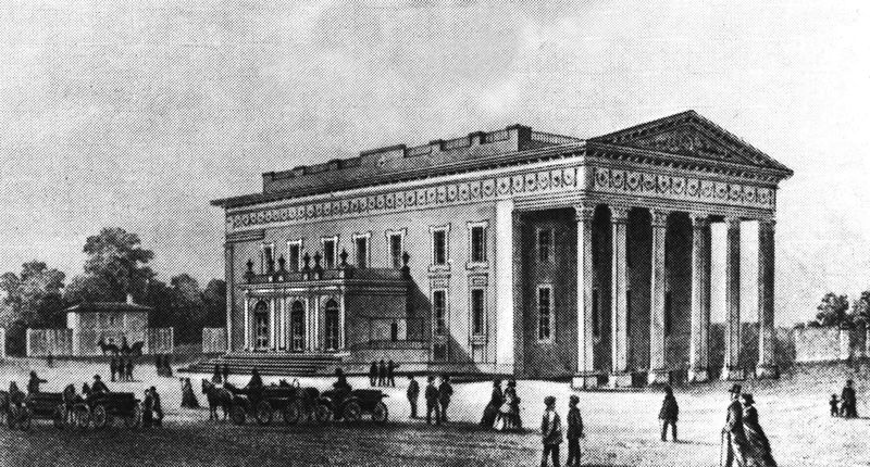Здание первого городского театра было построено по проекту итальянца Франческо Фраполли, а изменения в план внёс француз Тома де Томон, который возвел множество строений в тогдашней столице Российской империи – Петербурге. 10 февраля 1810 года состоялось торжественное открытие театра. Это было белоснежное строение наподобие античного храма, обращенное фасадом к порту. Зал насчитывал 800 мест (на тот момент в городе проживали 12,5 тысяч человек). На трех ярусах лож были установлены 44 кресла, позади которых находилось большое полукруглое пространство, откуда еще около 700 зрителей могли наслаждаться спектаклем стоя, как в старых итальянских театрах.