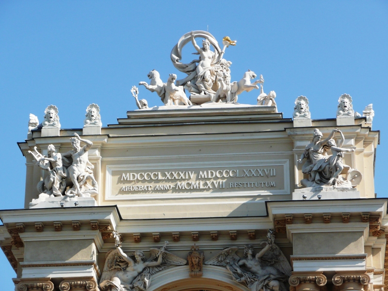 Венчают портик две скульптуры, воплощающие музыку и танец: слева – Орфей играет на кифаре кентавру, справа – муза танца Терпсихора обучает девочку своему искусству. На фронтоне портика римскими цифрами указаны несколько дат: в первой строке MDCCCLXXXIV-MDCCCLXXXVII – годы начала и окончания сооружения театра (1884 – 1887). Вторая строка содержит фразу «ardebat anno», что указывает на пожар 1925 года. Затем идет дата MCMLXVII (1967) и слово «restitutum» («восстановлен») как напоминание о реставрационных работах в театре.