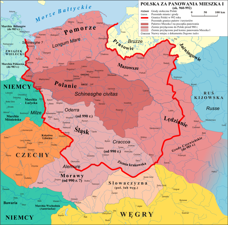 Civitas Schinesghe (на латыни — Polonia, на польском — Ziemia Polska) — первое зафиксированное название, связанное с Польшей как политическим образованием (название является латинизацией hrady knezske или grody książęce, то есть «герцогские крепости / oppidia»), впервые засвидетельствованное в 991 (992) году. Оригинальный акт утрачен, но он упоминается в папских регестах XI века под названием «Dagome iudex». В нем говорится, что князь из династии Пястов — Мешко I правил «unam civitatem in integro, que vocatur Schinesghe» («единым государством, которое называется Schinesghe»). Хотя само название «Польша» прямо не упоминается, «Schinesghe», скорее всего, относится к Гнезно — одному из главных поселений западнославянского племени полян. Их князь, Мешко, принял крещение после вступления в брак с княгиней Дубравой Чешской в 966 году. В 1000 году на Гнезненском съезде была основана первая польская архиепархия, а сын Мешко — князь Болеслав I Храбрый был признан императором и соправителем Оттона III, императора Священной Римской империи.